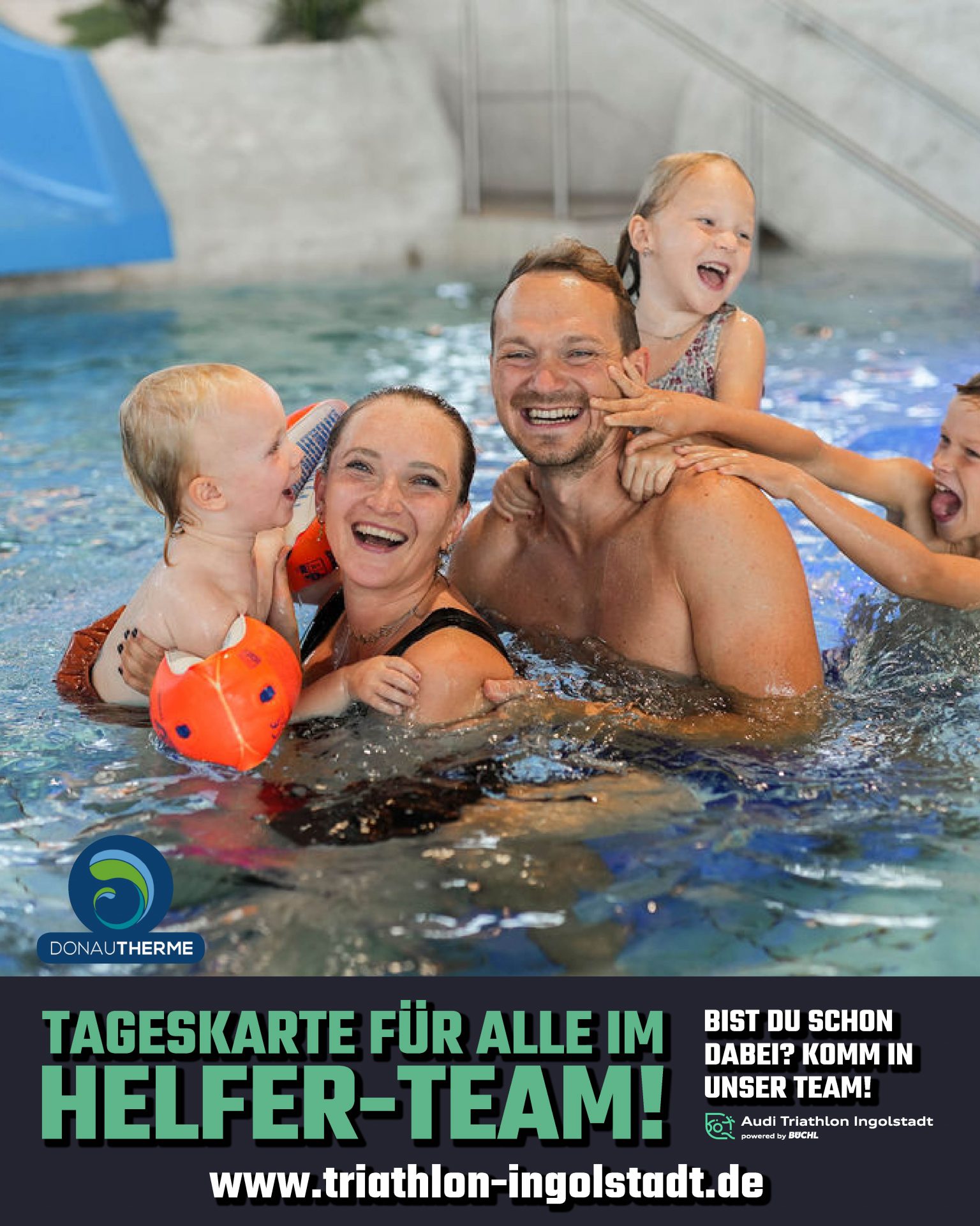 Jeder einzelne im Helfer-TEAM erhält eine Tageskarte für die Donautherme Ingolstadt! Mit dieser Karte erhältst du Zugang zum Erlebnisbad, zur Therme und zur Saunawelt. Ein ganzer Tag voller Entspannung und Wasserspaß erwartet dich!